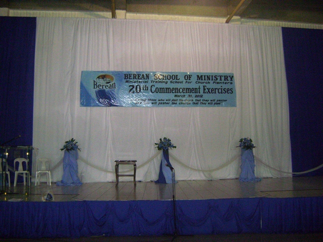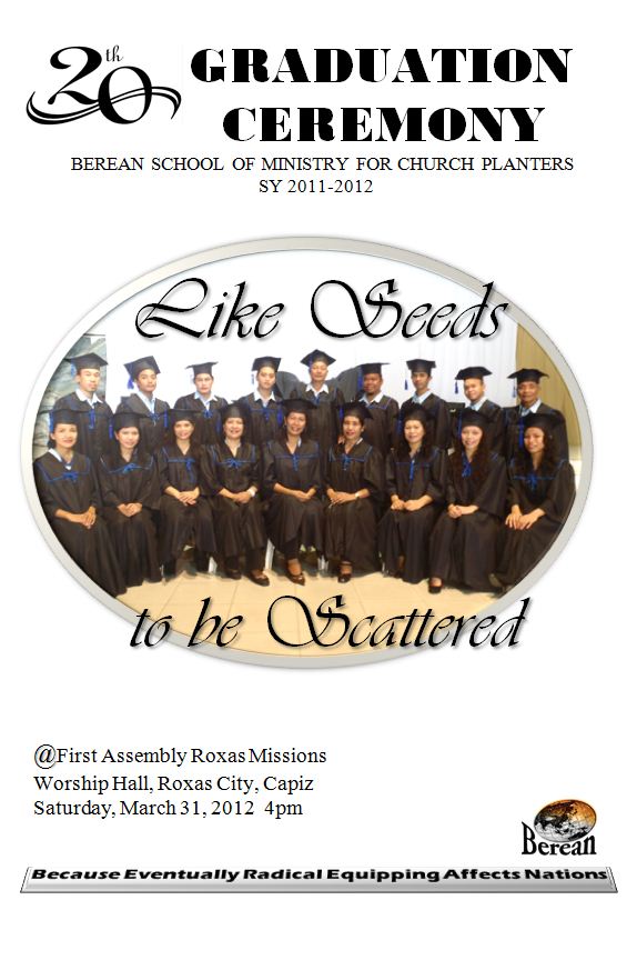 cises. Mrs. Franz Vasquez opened the event with these lines: “Graduation Day, a day when you say `I have done it!’ A Day of transition, a day to say `farewell’ , and a day to say `welcome’. For Berean School of Ministry students, it’s farewell to the safety of the four walls of the classroom, and a welcome to the challenges of the harvest field”. Then the processional started headed by the FARM Senior Pastor-BSM Director- PGCAG President and Home MIssions Department Director Rev. Rey Calusay along with the guest speaker Rev. Helen Bates. Following them were the Faculty and Staff, Parents, Sponsors and 18 ladies and gentlemen comprising BSM batch 20.