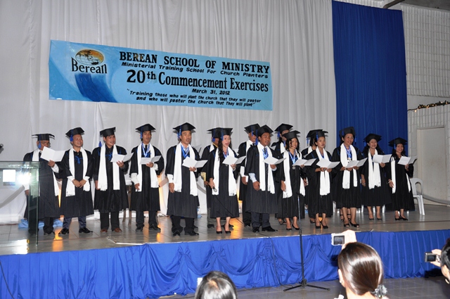 cises. Mrs. Franz Vasquez opened the event with these lines: “Graduation Day, a day when you say `I have done it!’ A Day of transition, a day to say `farewell’ , and a day to say `welcome’. For Berean School of Ministry students, it’s farewell to the safety of the four walls of the classroom, and a welcome to the challenges of the harvest field”. Then the processional started headed by the FARM Senior Pastor-BSM Director- PGCAG President and Home MIssions Department Director Rev. Rey Calusay along with the guest speaker Rev. Helen Bates. Following them were the Faculty and Staff, Parents, Sponsors and 18 ladies and gentlemen comprising BSM batch 20.
