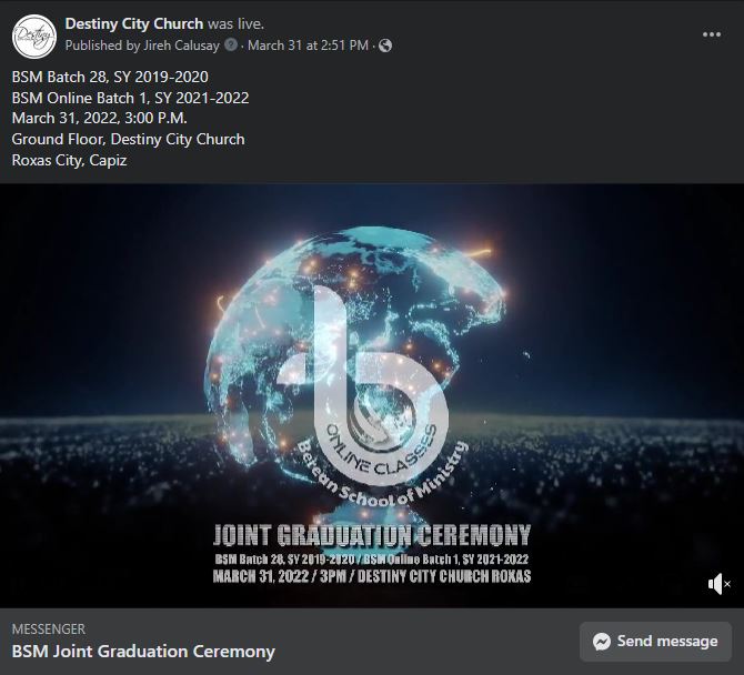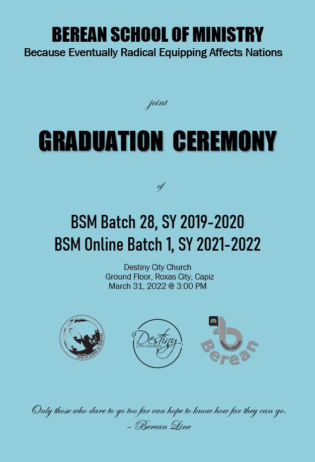 SY 2019-2020 and BSM Online Batch 1, SY 2021-2022 at the Worship Hall of Destiny City Church in March 31, 2022 @ 3:00 PM.