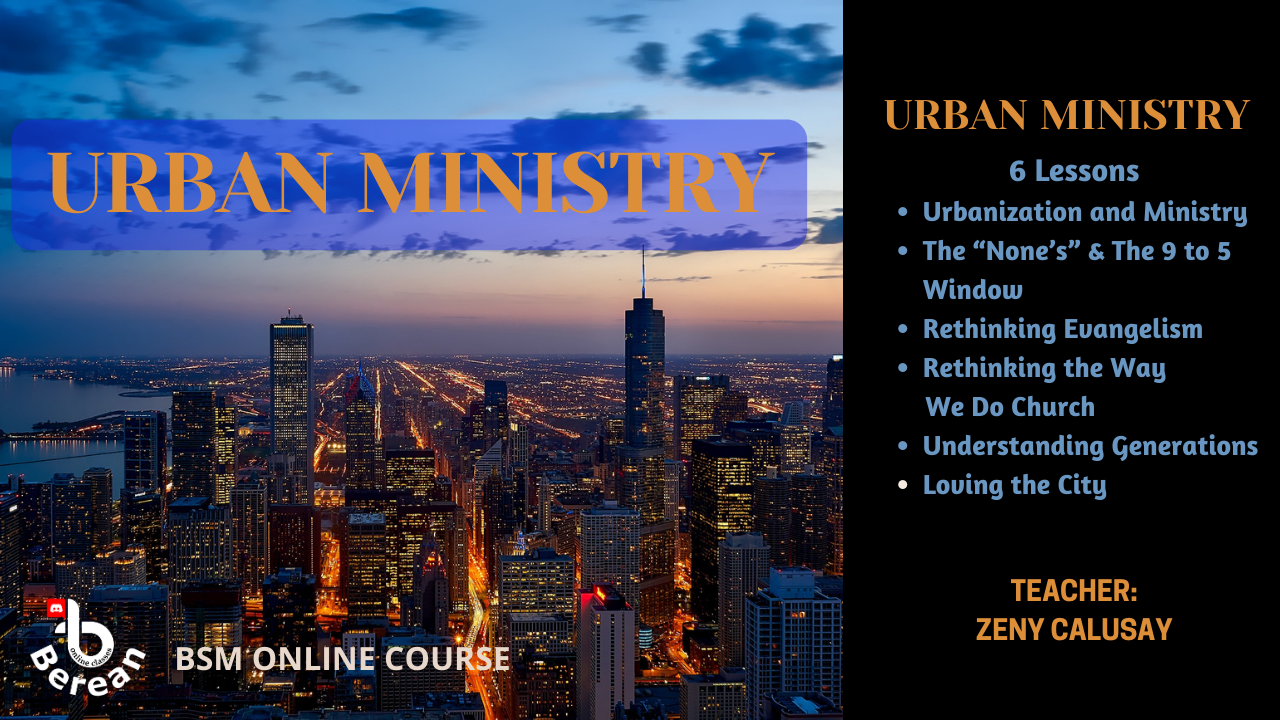 Urbanization refers to a process in which an increasing proportion of an entire population lives in cities and the suburbs of cities. Urbanization has effects on the ecology and economy of the region. But sociologists observe also that people’s psychology and lifestyles change in an urban environment. Undoubtedly, it will also affect the way we minister to people. We should equip ourselves for effective evangelism for the urban unreached. This course is designed to help the Christian, the pastors and churches to have more effective Urban Ministry.